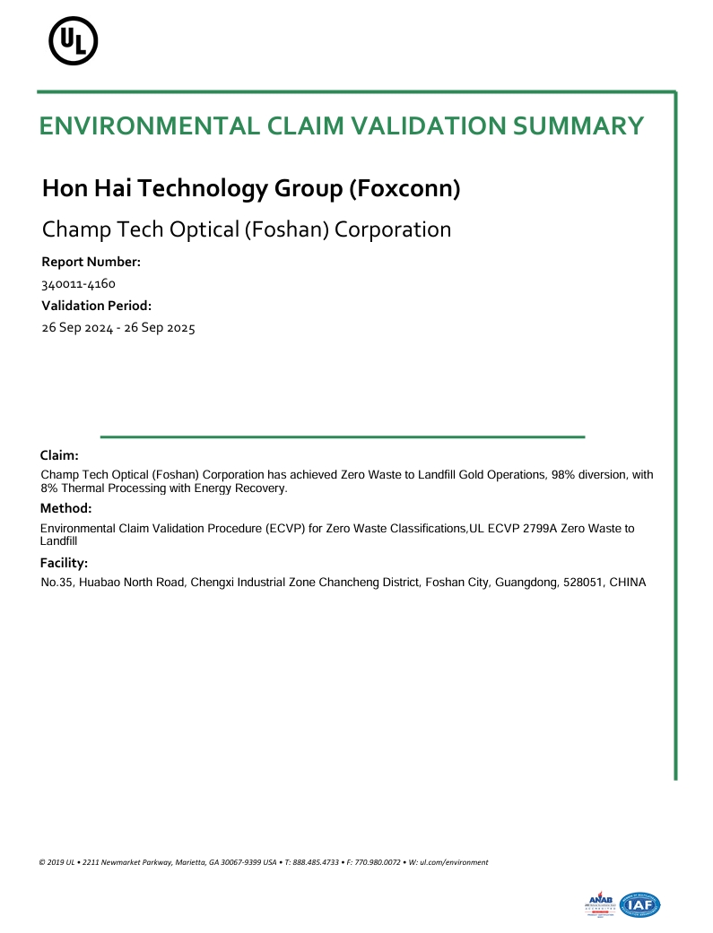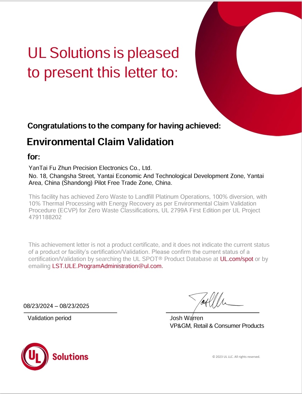 鴻準精密位於鴻海煙台園區內的100%子公司,煙台富准精密電子有限公司,現已實現了100%的廢棄物轉化率,其中10%透過回收熱處理轉化為能源,於今年八月取得UL 2799廢棄物零填埋最高級別的「鉑金級認證」。通過源頭減少原物料使用量、增加內外部包材的回收再利用等,多元綠色環保減量專案,逐步減少廢棄物的焚燒和填埋,以達成廢物轉化率100%、焚燒熱回收不超過10%的標準。同時,在廢棄物末端管制,通過集團研發的管理系統進行即時追蹤,並定期對委外廠商進行稽查,確保其合法處理廢棄物。
